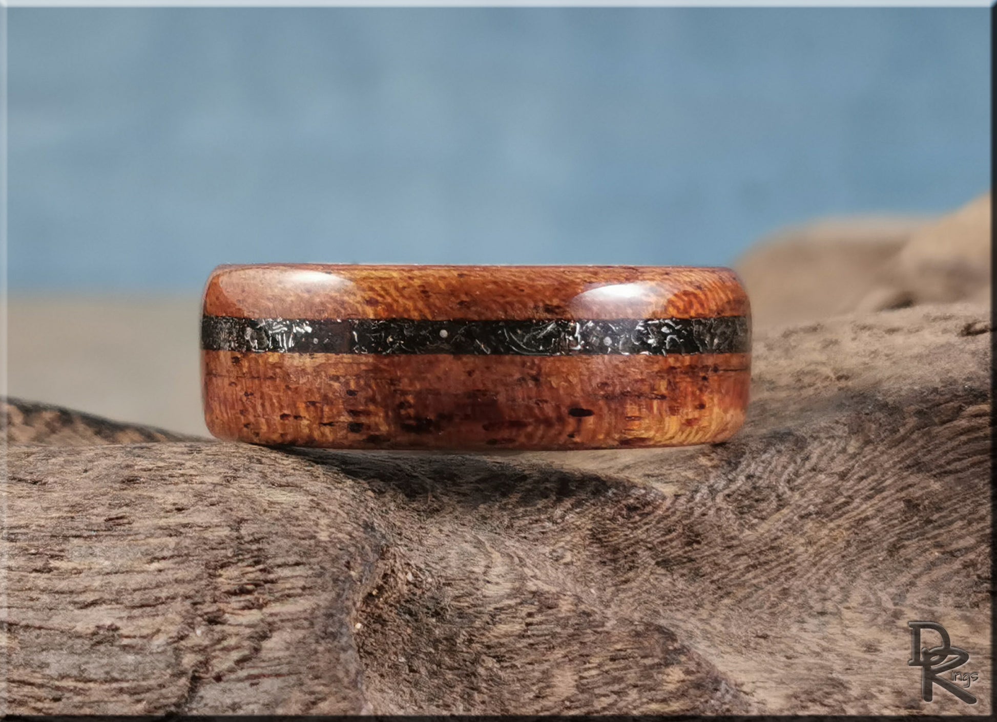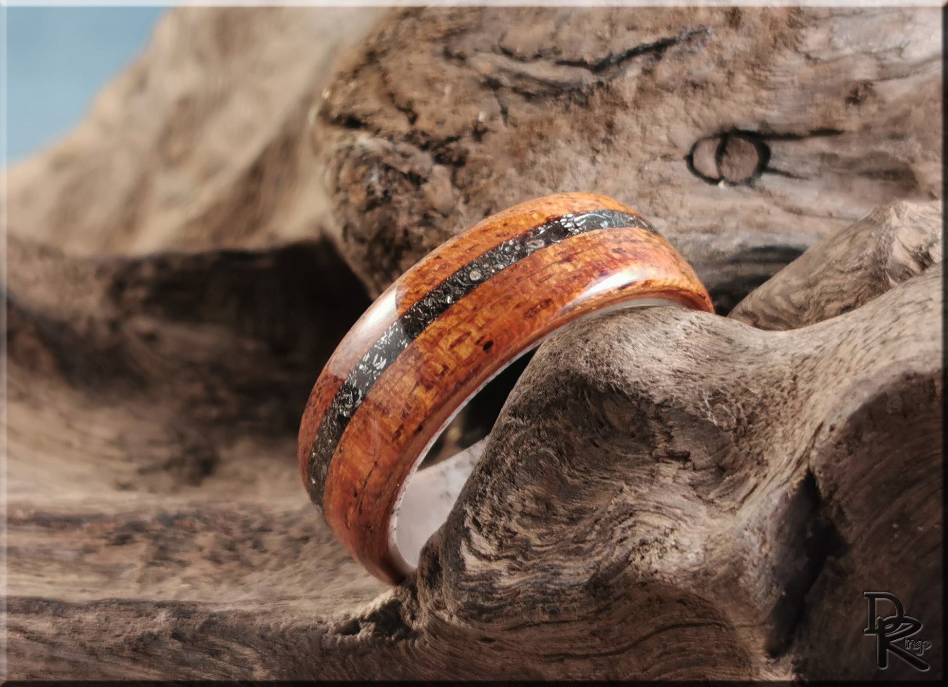This is a beautiful, handcrafted Artisan ring made in my small shop in Ottawa, Ontario, in Canada. Quartersawn Etimoe is a beautiful exotic wood that offers a cinnamon colouration and striking darker figuring. This design features a beautiful offset Glorieta Mountain Meteorite (New Mexico) inlay. Each ring is sealed and finished to a high polish. This ring is offered on a sustainably harvested (cast-off/shed) deer antler core in widths of 6mm or 8mm - but please ask about many other core options. US full and half ring sizes from 5 - 13 are available. If you require a custom order at a different size, please send me a message and I will do my best to accommodate. These rings are made using the Bentwood technique. This method of wrapping several layers of stabilised wood veneer around the core results in a stronger, more beautiful ring than those simply cut from blocks.