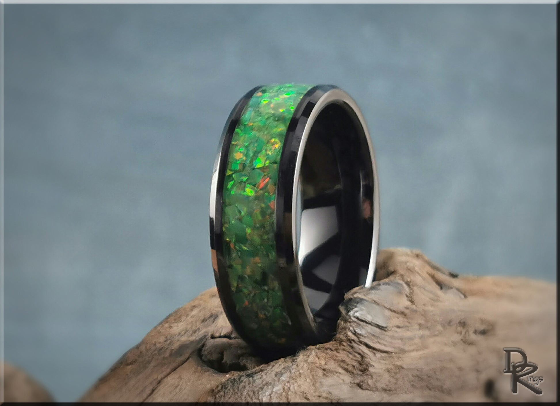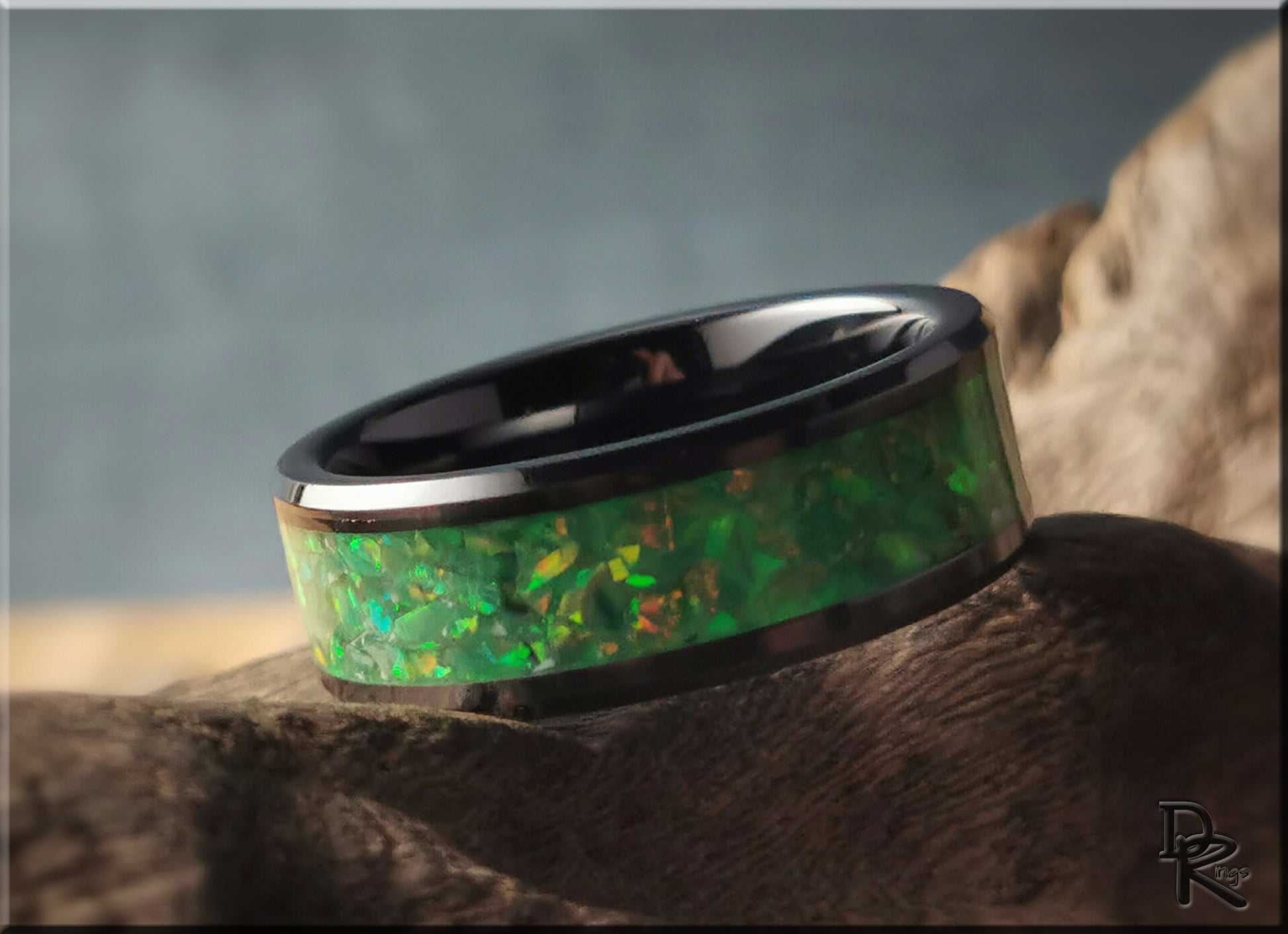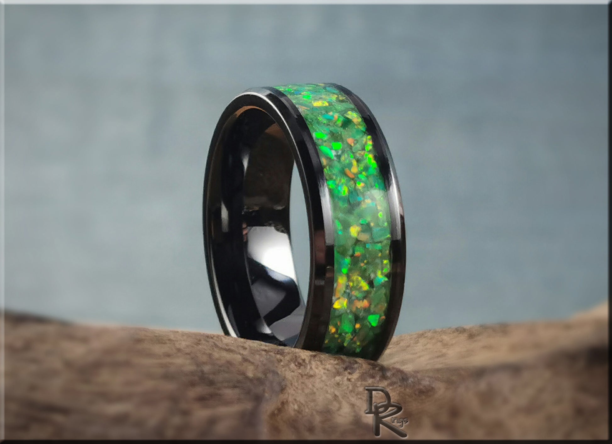 This is a beautiful, handcrafted Artisan ring made in my small shop in Ottawa, Ontario, in Canada. This ring is offered with a stunning Green Olive opal and Nuclear Green glow inlay on a polished black ceramic comfort fit core. US full and half ring sizes from 5 - 13 are available, in widths of 6mm or 8mm. If you require a custom order at a different size, please send me a message and I will do my best to accommodate.