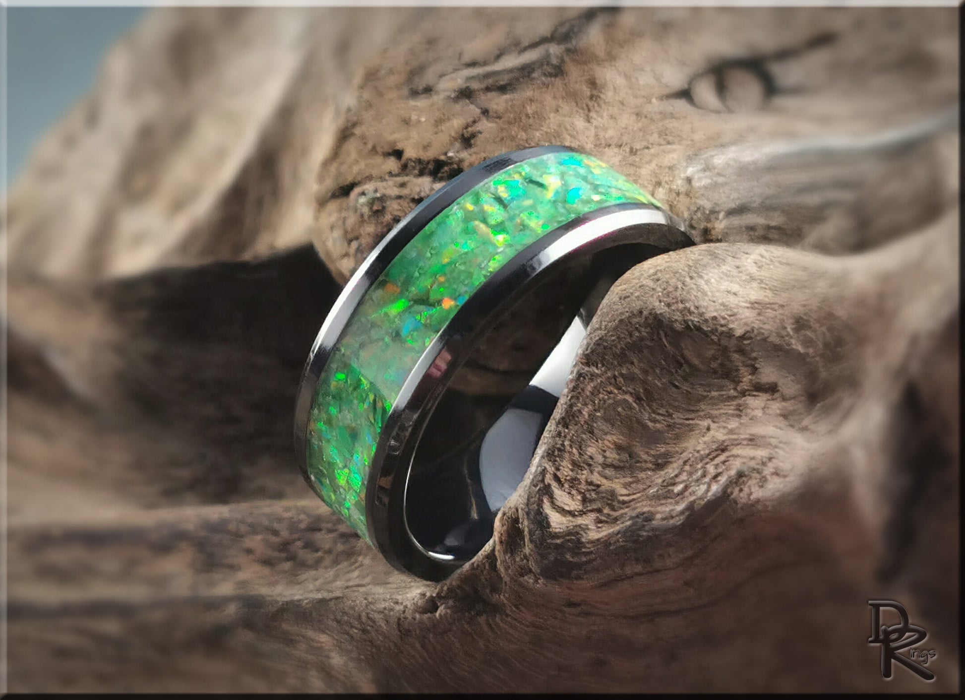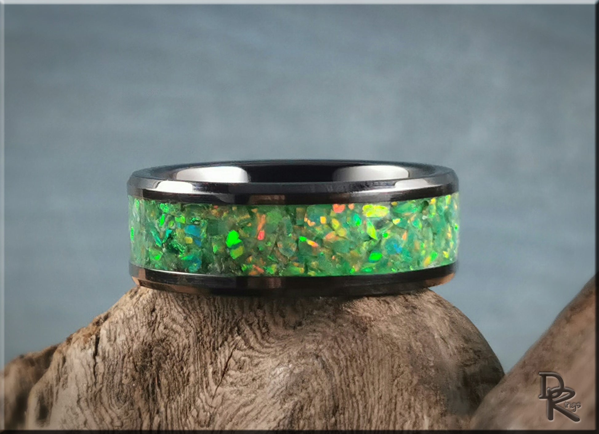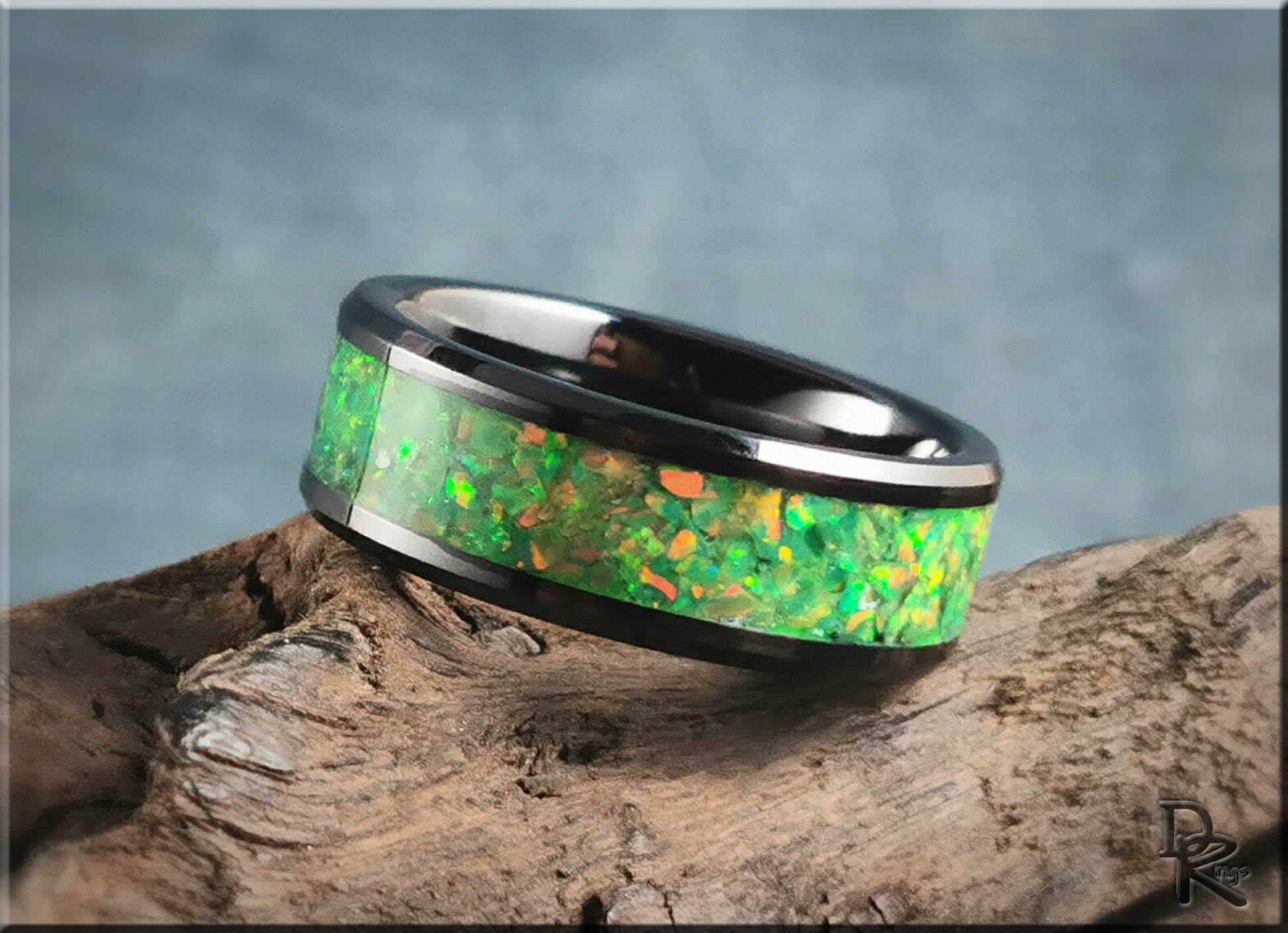 This is a beautiful, handcrafted Artisan ring made in my small shop in Ottawa, Ontario, in Canada. This ring is offered with a stunning Green Olive opal and Nuclear Green glow inlay on a polished black ceramic comfort fit core. US full and half ring sizes from 5 - 13 are available, in widths of 6mm or 8mm. If you require a custom order at a different size, please send me a message and I will do my best to accommodate.