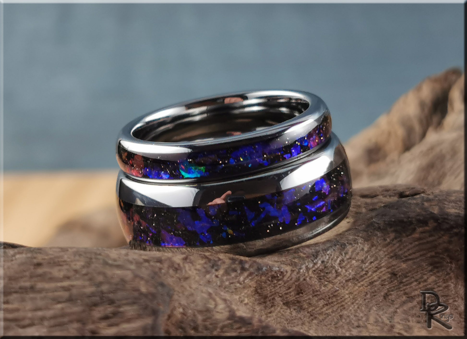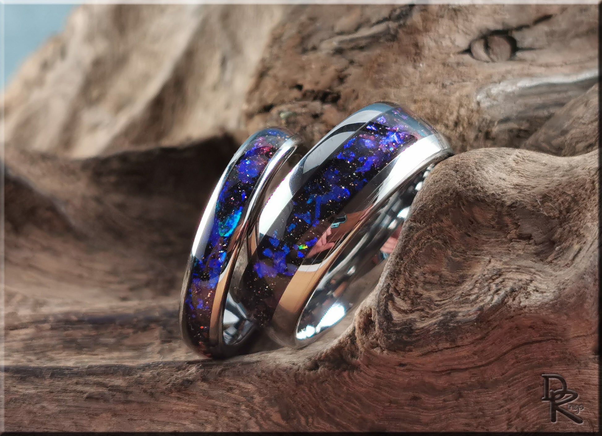 This is a beautiful, handcrafted Artisan ring set. The design features a stunning Celestial Sandstone inlay on a polished tungsten carbide comfort fit core. Please choose between 4mm and 8mm width options. Please enter a width and size for the primary ring in the standard tabs, and the width and size for the second ring in the 'Order special instructions' box at checkout. US full and half ring sizes from 5-11 (4mm width) and 7-13 (8mm) are available.