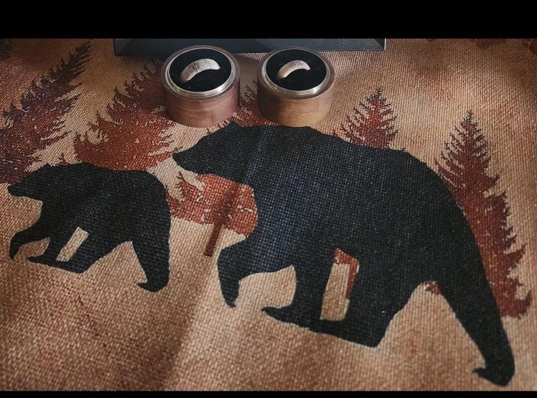 This is a beautiful, handcrafted Artisan ring set made in my small shop in Ottawa, Ontario, in Canada. This sustainably harvested (cast-off/shed) deer antler ring set is offered with 6mm and 8mm widths (but two of the same width is an option as well), in US full and half sizes 4-17. Please enter a width and size for the primary ring in the standard drop down tabs, and the width and size for the second ring in the 'Order special instructions' box at checkout. Luxurious, solid Walnut boxes with shop logo are available as a presentation upgrade.