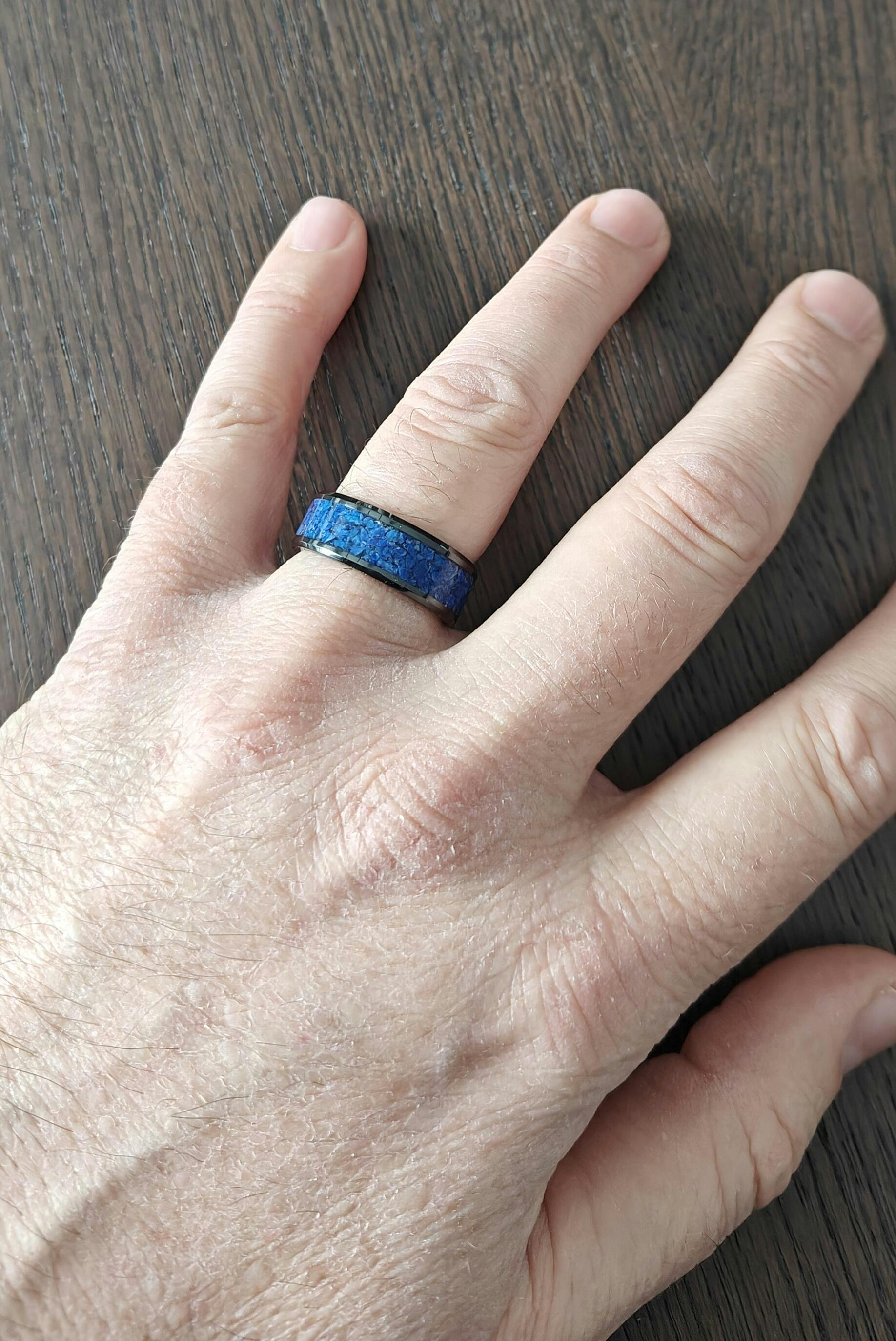 This is a beautiful, handcrafted Artisan ring made in my small shop in Ottawa, Ontario, in Canada. This design is offered with a stunning Lapis Lazuli stone inlay on a polished black comfort fit ceramic core. US full and half ring sizes from 5 - 13 are available, in widths of 4mm, 6mm, and 8mm. If you require a custom order at a different size, please send me a message and I will do my best to accommodate.